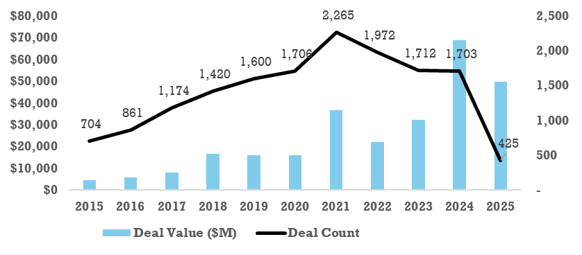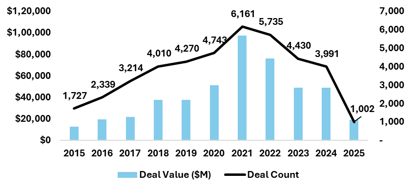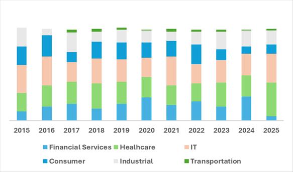 • Both deal value and count dipped slightly after 2022, reflecting the global VC downturn, but the rebound in 2025 shows renewed US appetite, especially in AI-led investments.