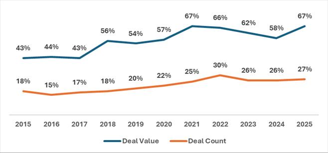 • While deal value surged quickly, deal count grew more gradually from ~15% in 2016 to ~25% by 2022, suggesting that US investors remain selective in terms of volume but dominant in terms of capital deployed per deal.