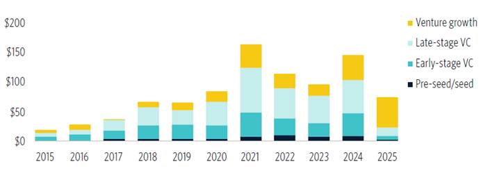 AI & ML VC deal value ($B) by stage
